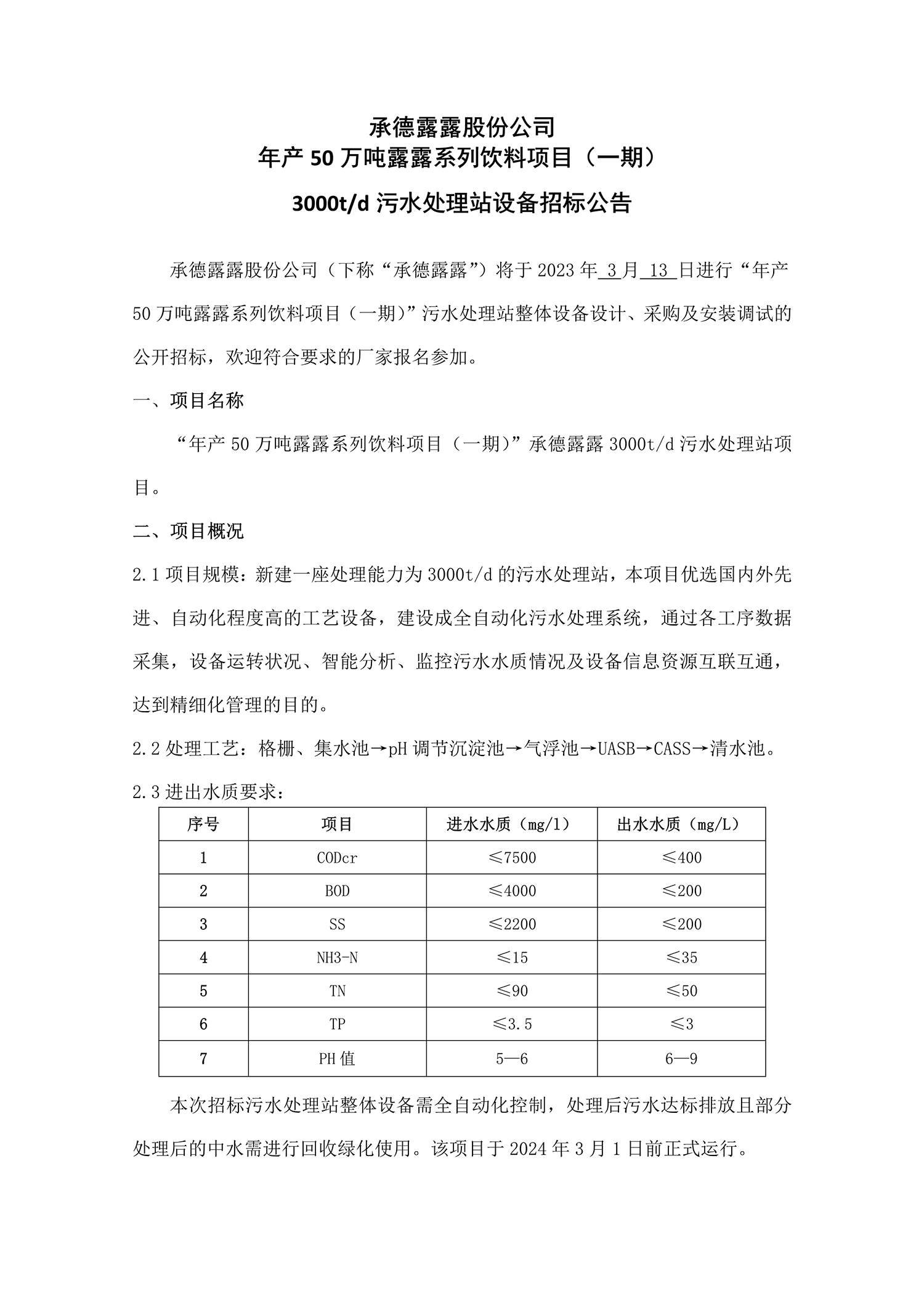 承德露露股份公司 年產50萬噸露露系列飲料項目(一期) 3000t/d污水處理站設備招標公告